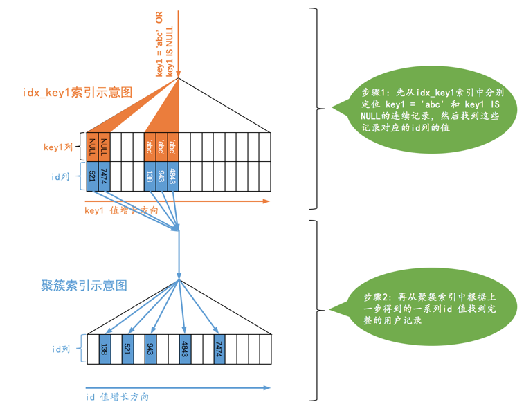 可以看到,上面的查询相当于先分别从idx_key1索引对应的B+树中找出key1 IS NULL和key1 = 'abc'的两个连续的记录范围,然后根据这些二级索引记录中的id值再回表查找完整的用户记录。