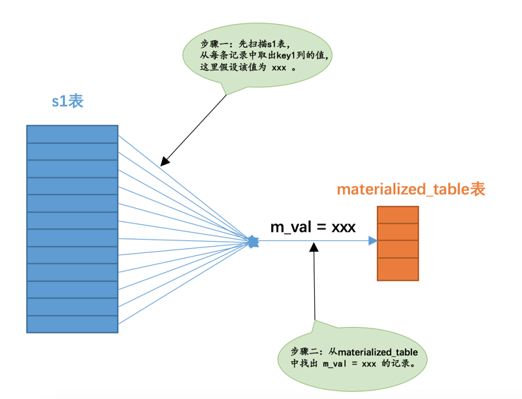 key1是否在物化表的结果集中可以加快查询执行的速度。小贴士:请注意这里将子查询物化之后不能转为和外层查询的表的连接,只能是先扫描s1表,然后对s1表的某条记录来说,判断该记录的key1值在不在物化表中。不管子查询是相关的还是不相关的,都可以把