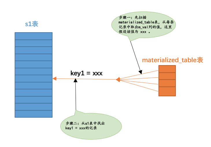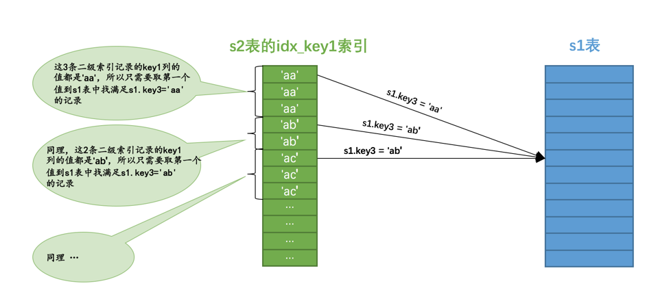 s2表的idx_key1索引中,值为'aa'的二级索引记录一共有3条,那么只需要取第一条的值到s1表中查找s1.key3 = 'aa'的记录,如果能在s1表中找到对应的记录,那么就把对应的记录加入到结果集。依此类推,其他值相同的二级索引记录,也只需要取第一条记录的值到s1表中找匹配的记录,这种虽然是扫描索引,但只取值相同的记录的第一条去做匹配操作的方式称之为松散索引扫描。Semi-join Materialization execution strategy