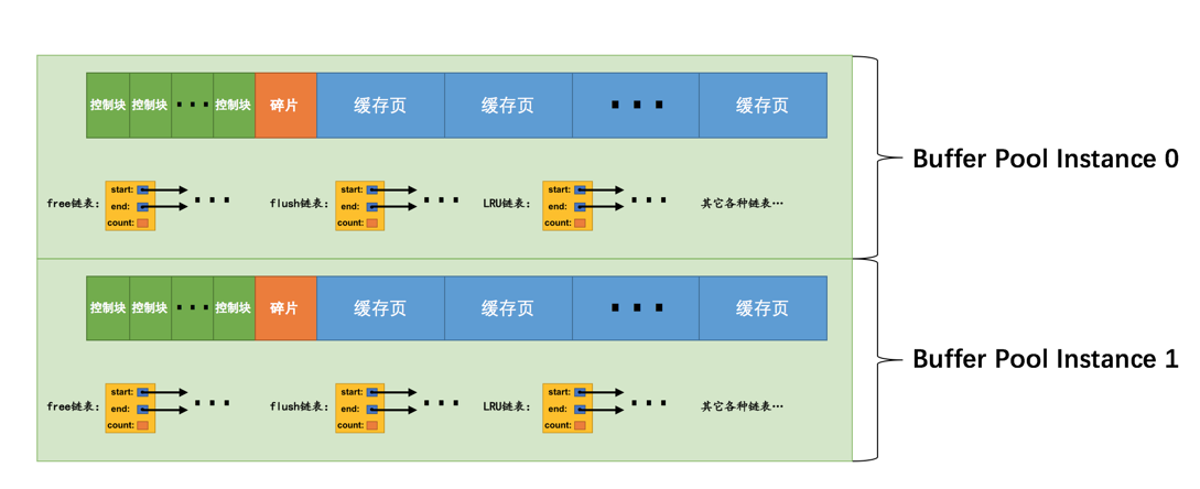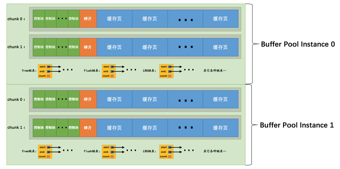 上图代表的Buffer Pool就是由2个实例组成的,每个实例中又包含2个chunk。