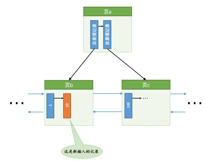 10的记录,很显然需要被插入到页b中,由于页b现在有足够的空间容纳一条记录,所以直接将该记录插入到页b中就好了,就像这样: