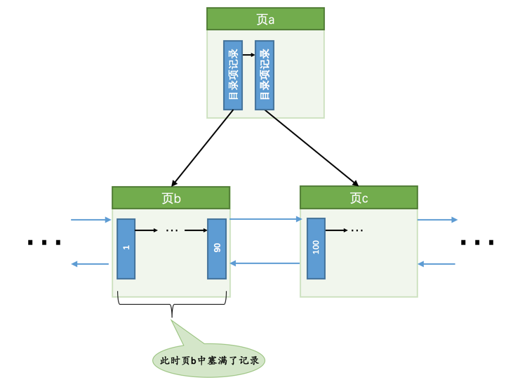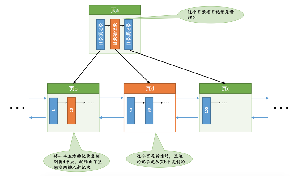 页分裂操作,也就是新建一个叶子节点,然后把原先数据页中的一部分记录复制到这个新的数据页中,然后再把记录插入进去,把这个叶子节点插入到叶子节点链表中,最后还要在内节点中添加一条目录项记录指向这个新创建的页面。很显然,这个过程要对多个页面进行修改,也就意味着会产生多条redo日志,我们把这种情况称之为悲观插入。假如某个索引对应的B+树长这样: