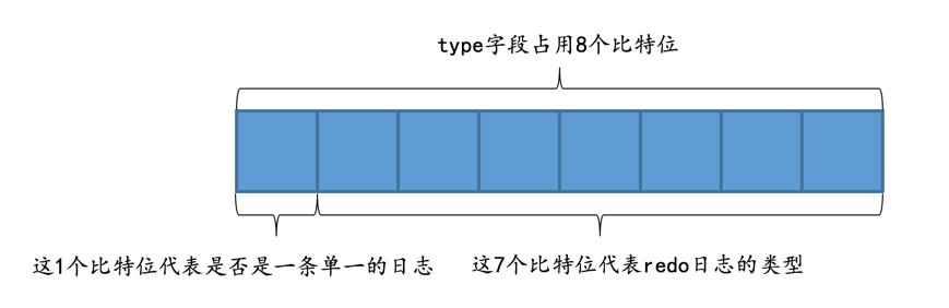 MLOG_MULTI_REC_END的redo日志也是可以的,不过设计InnoDB的大佬比较勤俭节约,他们不想浪费一个比特位。别忘了虽然redo日志的类型比较多,但撑死了也就是几十种,是小于127这个数字的,也就是说我们用7个比特位就足以包括所有的redo日志类型,而type字段其实是占用1个字节的,也就是说我们可以省出来一个比特位用来表示该需要保证原子性的操作只产生单一的一条redo日志,示意图如下: