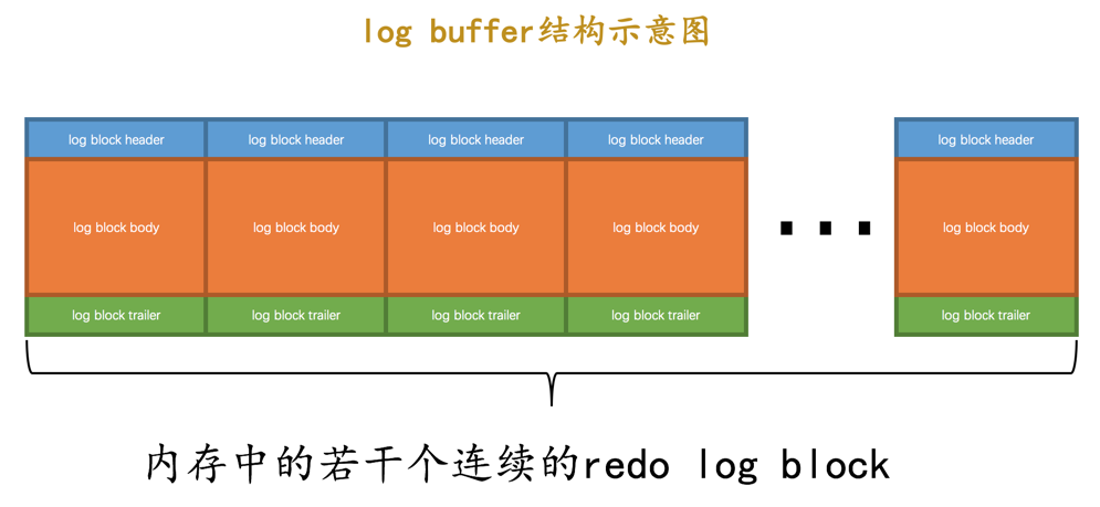 我们前面说过,设计InnoDB的大佬为了解决磁盘速度过慢的问题而引入了Buffer Pool。同理,写入redo日志时也不能直接直接写到磁盘上,实际上在服务器启动时就向操作系统申请了一大片称之为redo log buffer的连续内存空间,翻译成中文就是redo日志缓冲区,我们也可以简称为log buffer。这片内存空间被划分成若干个连续的redo log block,就像这样: