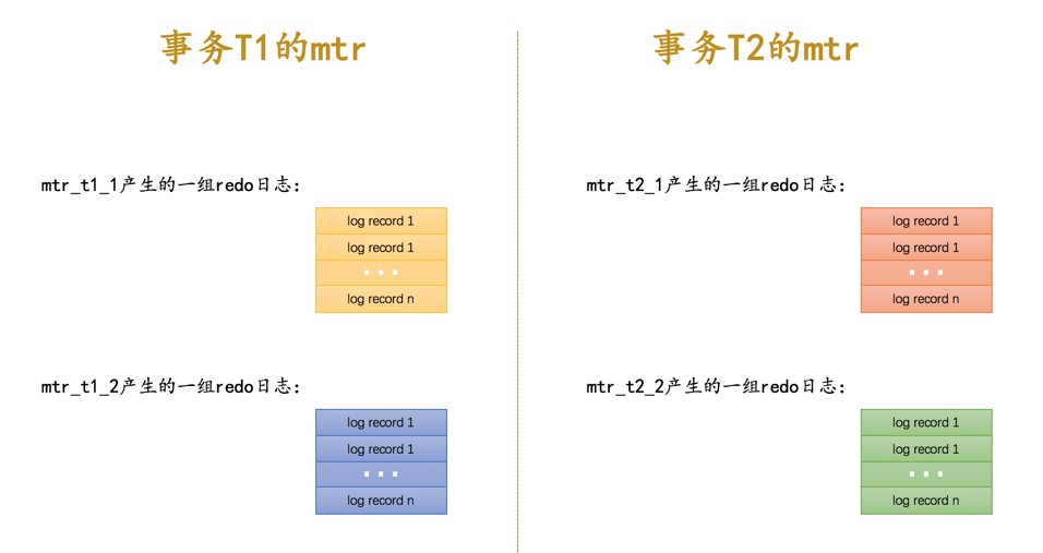 每个mtr都会产生一组redo日志,用示意图来描述一下这些mtr产生的日志情况:
