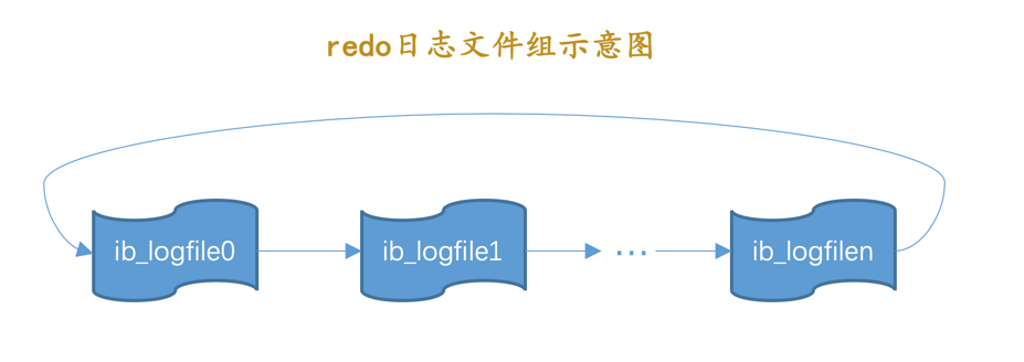 从上面的描述中可以看到,磁盘上的redo日志文件不只一个,而是以一个日志文件组的形式出现的。这些文件以ib_logfile[数字](数字可以是0、1、2...)的形式进行命名。在将redo日志写入日志文件组时,是从ib_logfile0开始写,如果ib_logfile0写满了,就接着ib_logfile1写,同理,ib_logfile1写满了就去写ib_logfile2,依此类推。如果写到最后一个文件该咋办?那就重新转到ib_logfile0继续写,所以整个过程如下图所示: