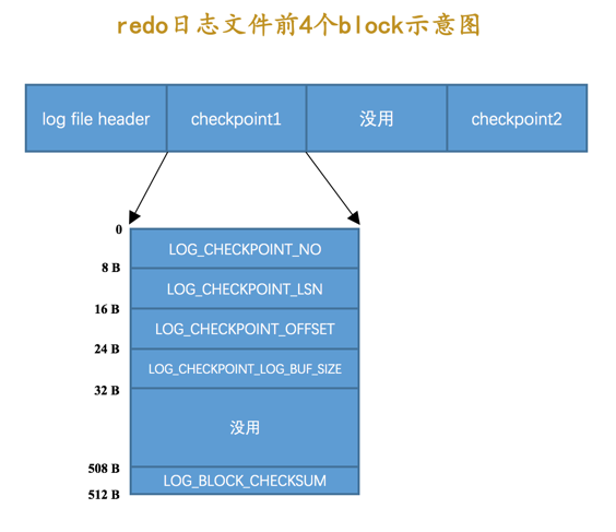 属性名 长度(单位:字节) 描述 LOG_CHECKPOINT_NO8服务器做 checkpoint的编号,每做一次checkpoint,该值就加1。LOG_CHECKPOINT_LSN8服务器做 checkpoint结束时对应的LSN值,系统奔溃恢复时将从该值开始。LOG_CHECKPOINT_OFFSET8上个属性中的 LSN值在redo日志文件组中的偏移量LOG_CHECKPOINT_LOG_BUF_SIZE8服务器在做 checkpoint操作时对应的log buffer的大小LOG_BLOCK_CHECKSUM4本block的校验值,所有block都有,我们不关心 小贴士:现在看不懂上面这些关于checkpoint和LSN的属性的释义是很正常的,我就是想让大家对上面这些属性混个脸熟,后边我们后详细介绍的。第三个block未使用,忽略~