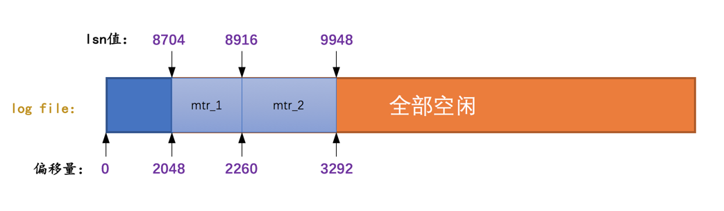 初始时的LSN值是8704,对应文件偏移量2048,之后每个mtr向磁盘中写入多少字节日志,lsn的值就增长多少。