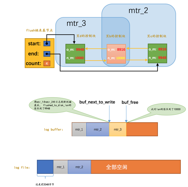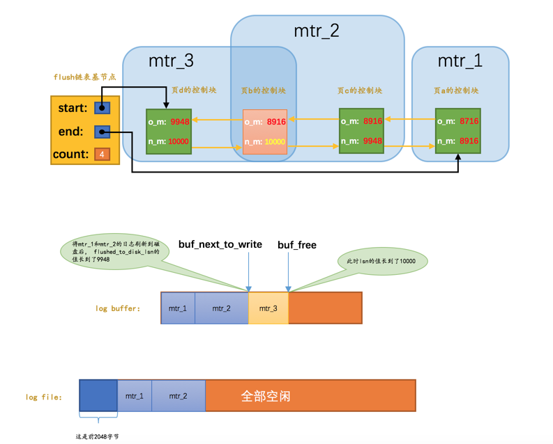 log buffer中写入了mtr_1、mtr_2、mtr_3这三个mtr产生的redo日志,假设这三个mtr开始和结束时对应的lsn值分别是:mtr_1:8716 ~ 8916mtr_2:8916 ~ 9948mtr_3:9948 ~ 10000
