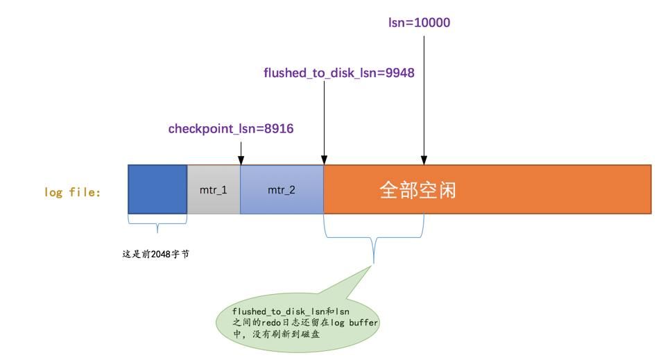 小贴士:为什么初始的lsn值为8704呢?我也不太清楚,人家就这么规定的。其实你也可以规定你一生下来算1岁,只要保证随着时间的流逝,你的年龄不断增长就好了。从上面的描述中可以看出来,每一组由mtr生成的redo日志都有一个唯一的LSN值与其对应,LSN值越小,说明redo日志产生的越早。
