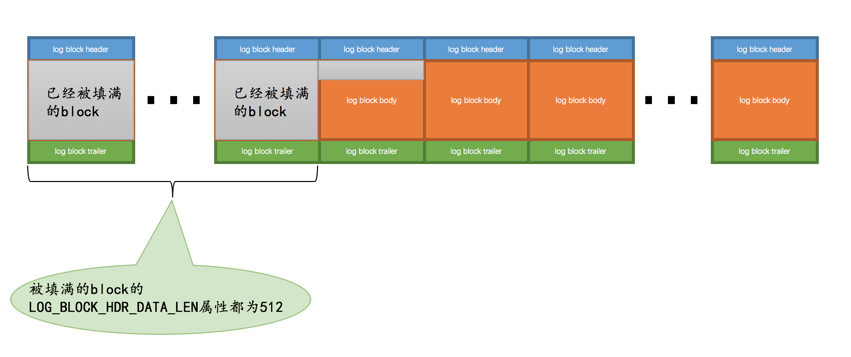 redo日志恢复的起点确定了,那终点是哪个呢?这个还得从block的结构说起。我们说在写redo日志的时候都是顺序写的,写满了一个block之后会再往下一个block中写: