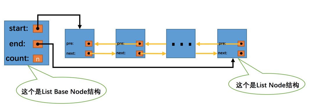 所以使用List Base Node和List Node这两个结构组成的链表的示意图就是这样: