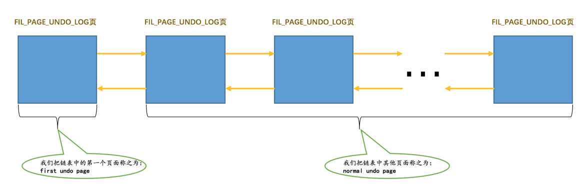 大家往上再瞅一瞅上面的图,我们特意把链表中的第一个Undo页面给标了出来,称它为first undo page,其余的Undo页面称之为normal undo page,这是因为在first undo page中除了记录Undo Page Header之外,还会记录其他的一些管理信息,这个我们稍后再说。