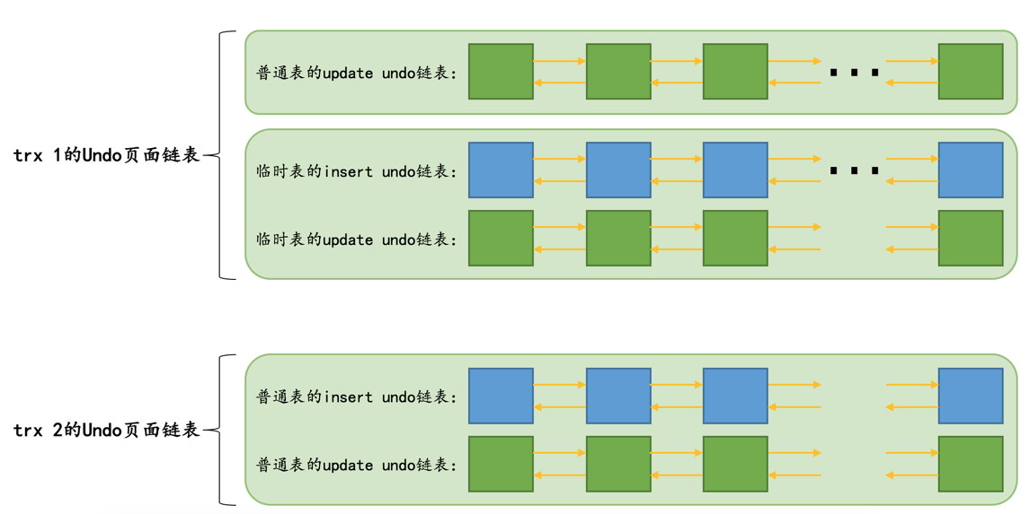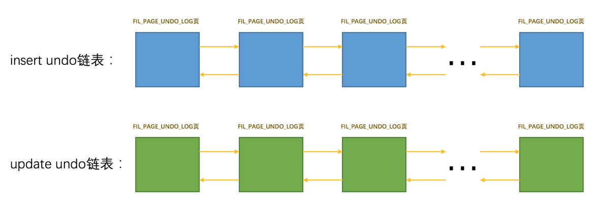 在一个事务执行过程中,可能混着执行INSERT、DELETE、UPDATE语句,也就意味着会产生不同类型的undo日志。但是我们前面又强调过,同一个Undo页面要么只存储TRX_UNDO_INSERT大类的undo日志,要么只存储TRX_UNDO_UPDATE大类的undo日志,反正不能混着存,所以在一个事务执行过程中就可能需要2个Undo页面的链表,一个称之为insert undo链表,另一个称之为update undo链表,画个示意图就是这样: