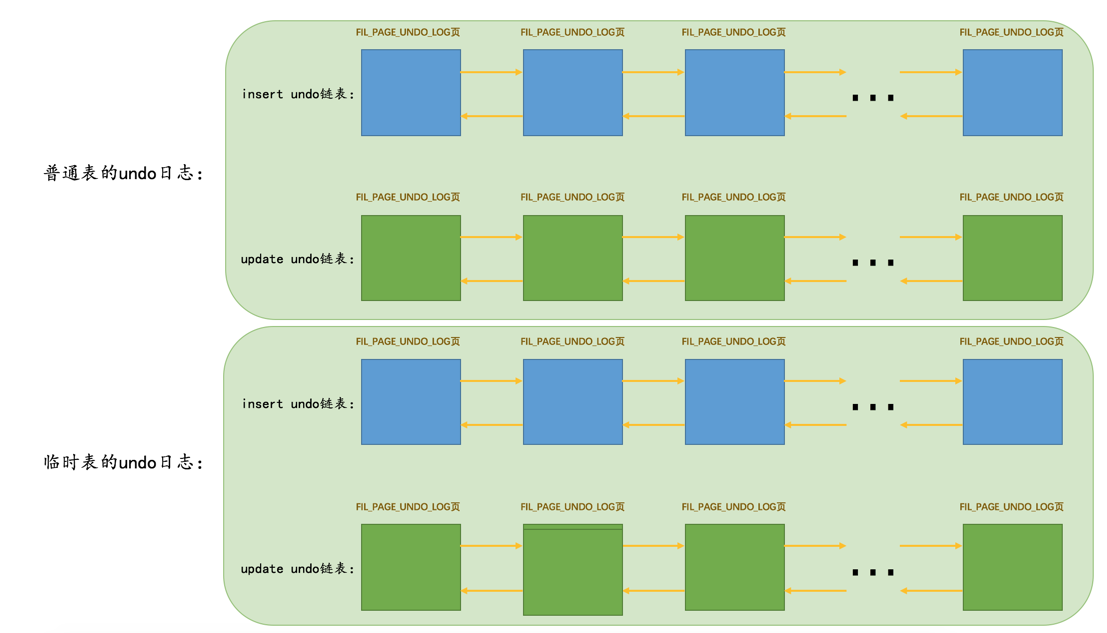 普通表的insert undo链表。 - 当事务执行过程中删除或者更新了普通表中的记录之后,就会为其分配一个