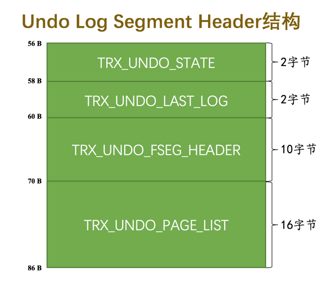 小贴士:Undo页面链表什么时候会被重用,怎么重用我们之后会详细说的。事务的PREPARE阶段是在所谓的分布式事务中才出现的,本书中不会介绍更多关于分布式事务的事情,所以大家目前忽略这个状态就好了。TRX_UNDO_LAST_LOG:本Undo页面链表中最后一个Undo Log Header的位置。小贴士:关于什么是Undo Log Header,我们稍后马上介绍。TRX_UNDO_FSEG_HEADER:本Undo页面链表对应的段的Segment Header信息(就是我们上一节介绍的那个10字节结构,通过这个信息可以找到该段对应的INODE Entry)。TRX_UNDO_PAGE_LIST:Undo页面链表的基节点。我们上面说